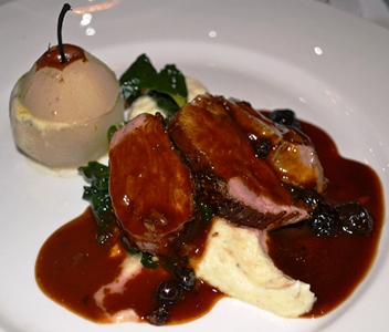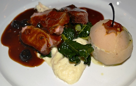 Crispy Duck with Braised Kale, Roasted Pear, Celeriac Purée, and Blueberry Dem-Glace.