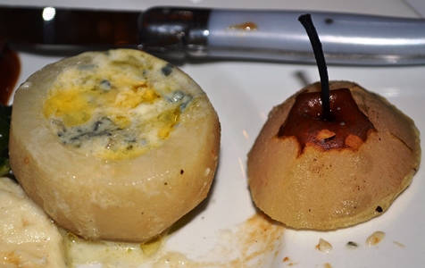 Poached pear with mild blue cheese inside. |
