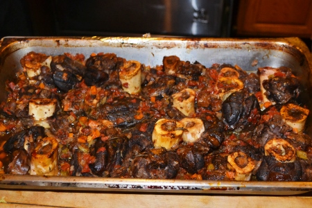Venison Osso Buco over Soft Pol-Lina with Roasted Vegetables.