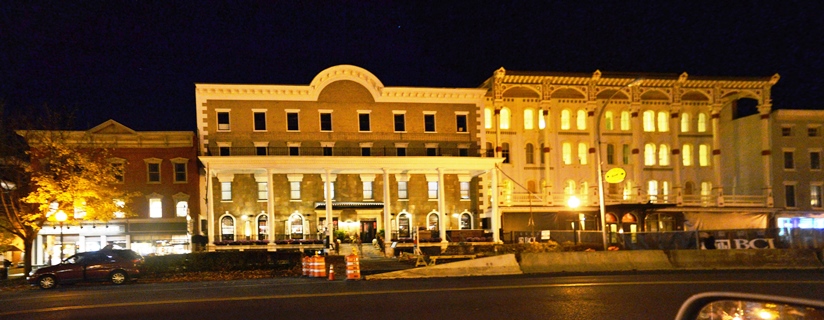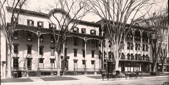 Front view of the Rip Van Dam Hotel (center) and the Adelphi Hotel (right).
