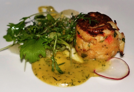 Crab Cake, Dijonnaise, Mustard Greens and Locally-Grown Radishes.