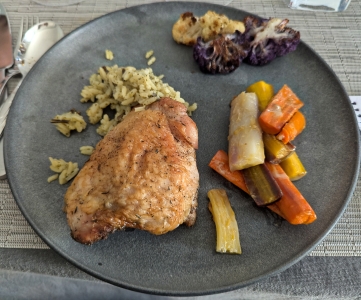 With more of Salil's famous chicken thighs with carrots, cauliflower, and wild rice.