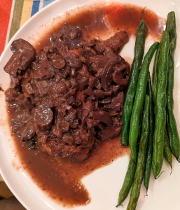 Chicken with mushroom in red wine sauce, string beans. Rich and delicious.