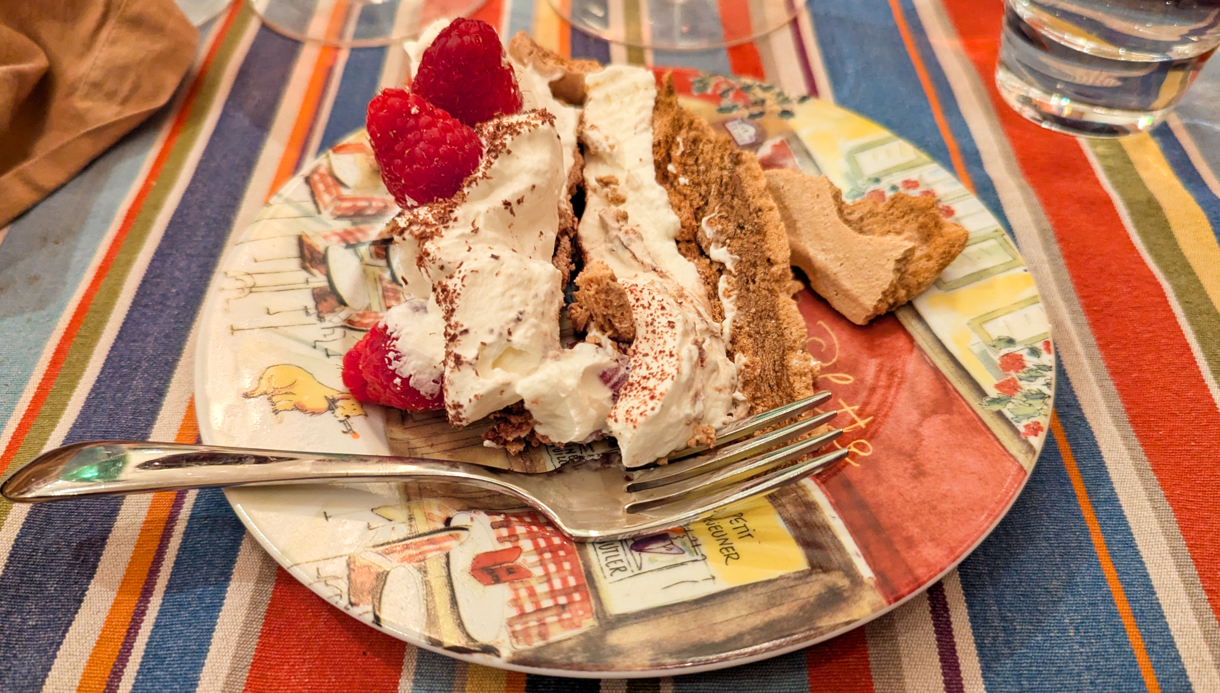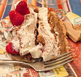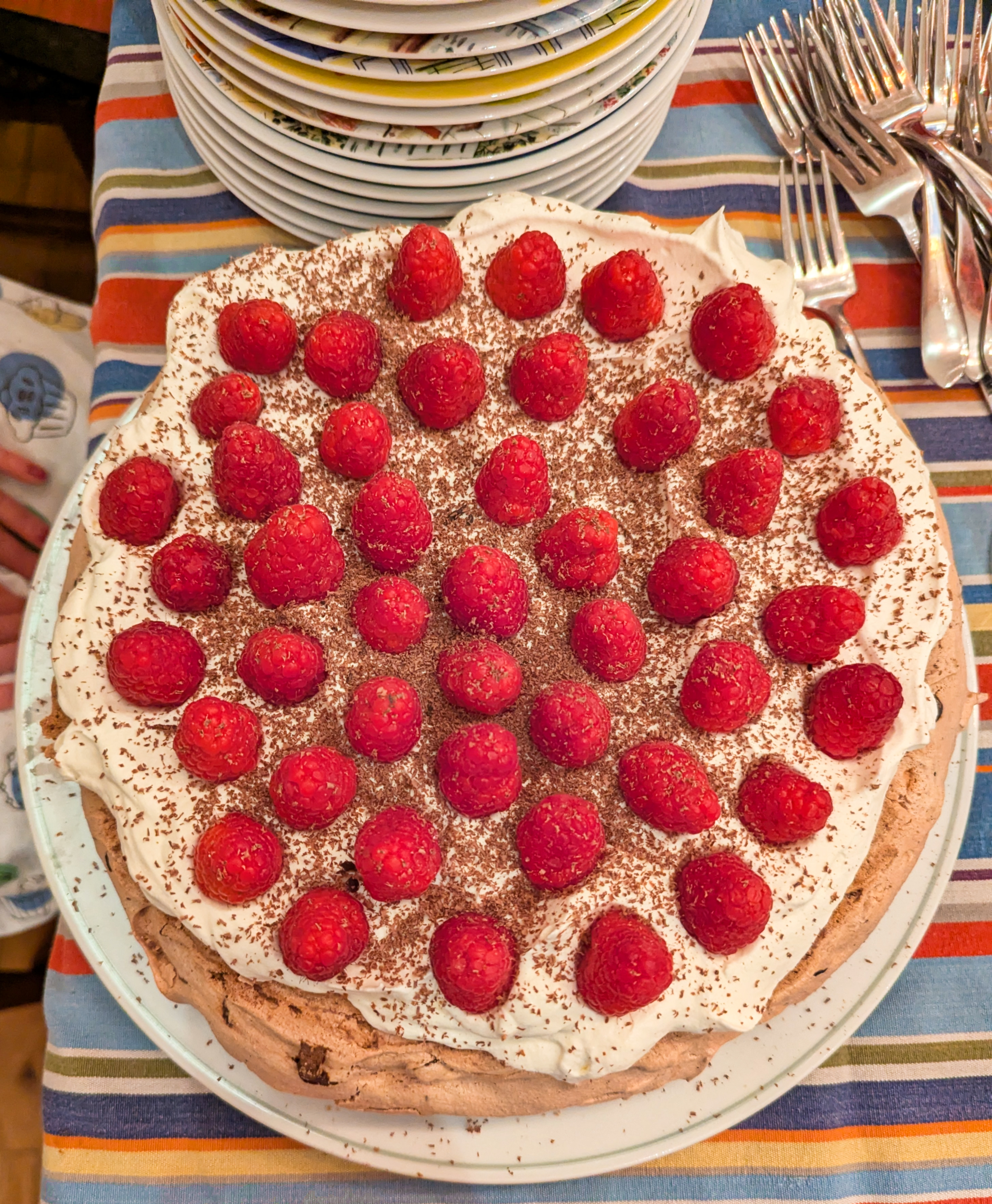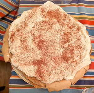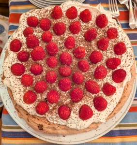 Homemade chocolate pavlova with raspberries and homemade coffee pavlova.