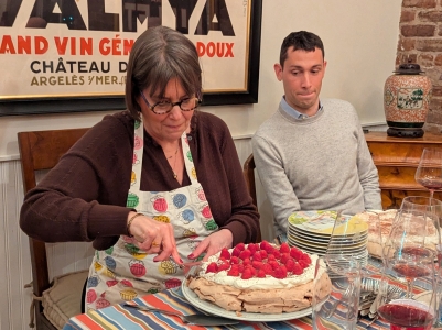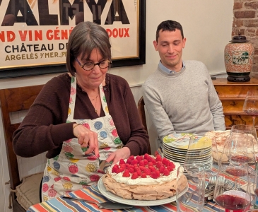 Note Rob's anticipation as Wendy cuts the her pavlovas: