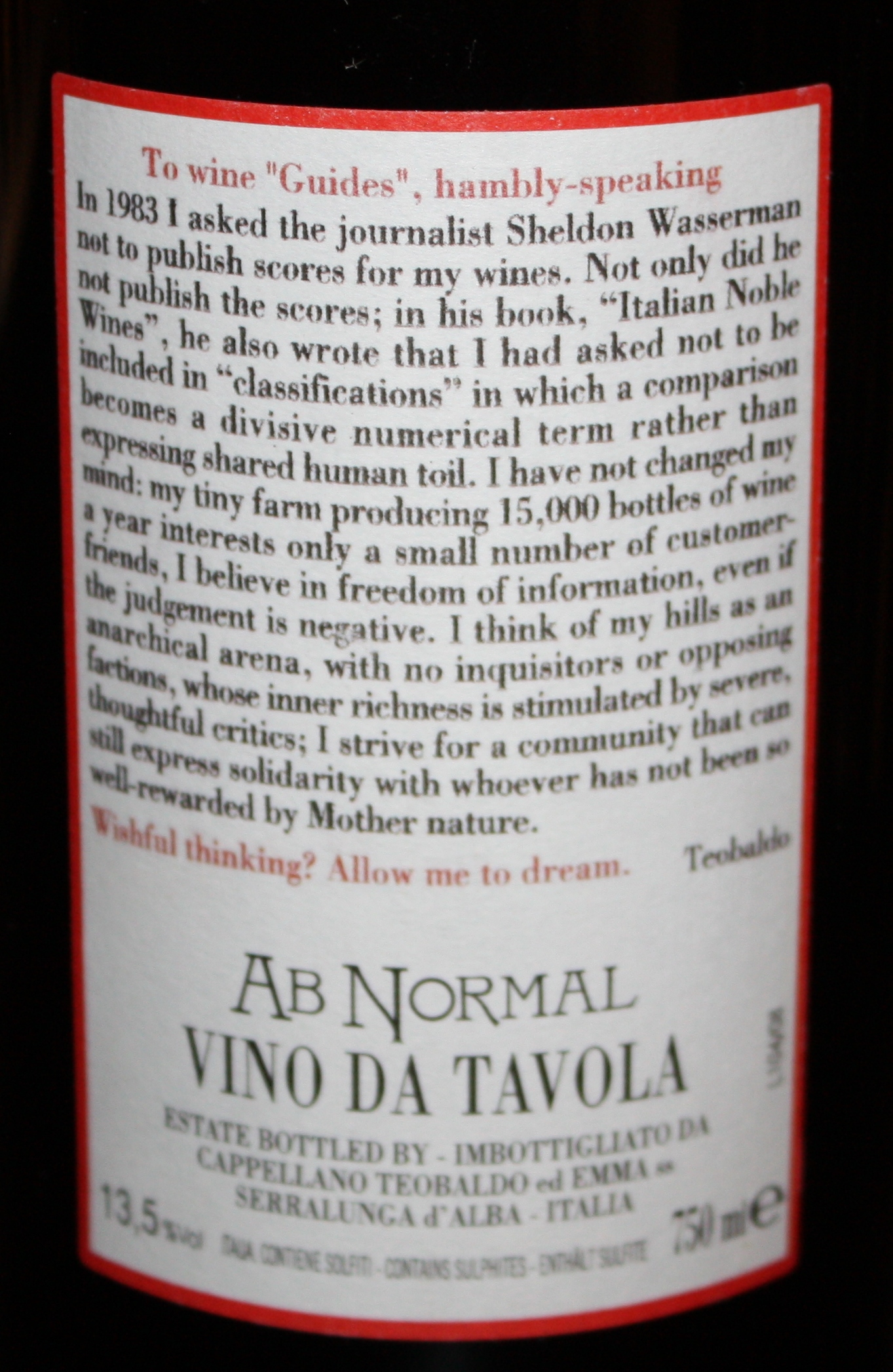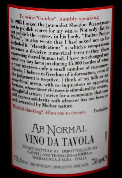 Rather than filter or otherwise process the wine, Baldo bottled the wine as a vino da tavola with the name Ab Normal