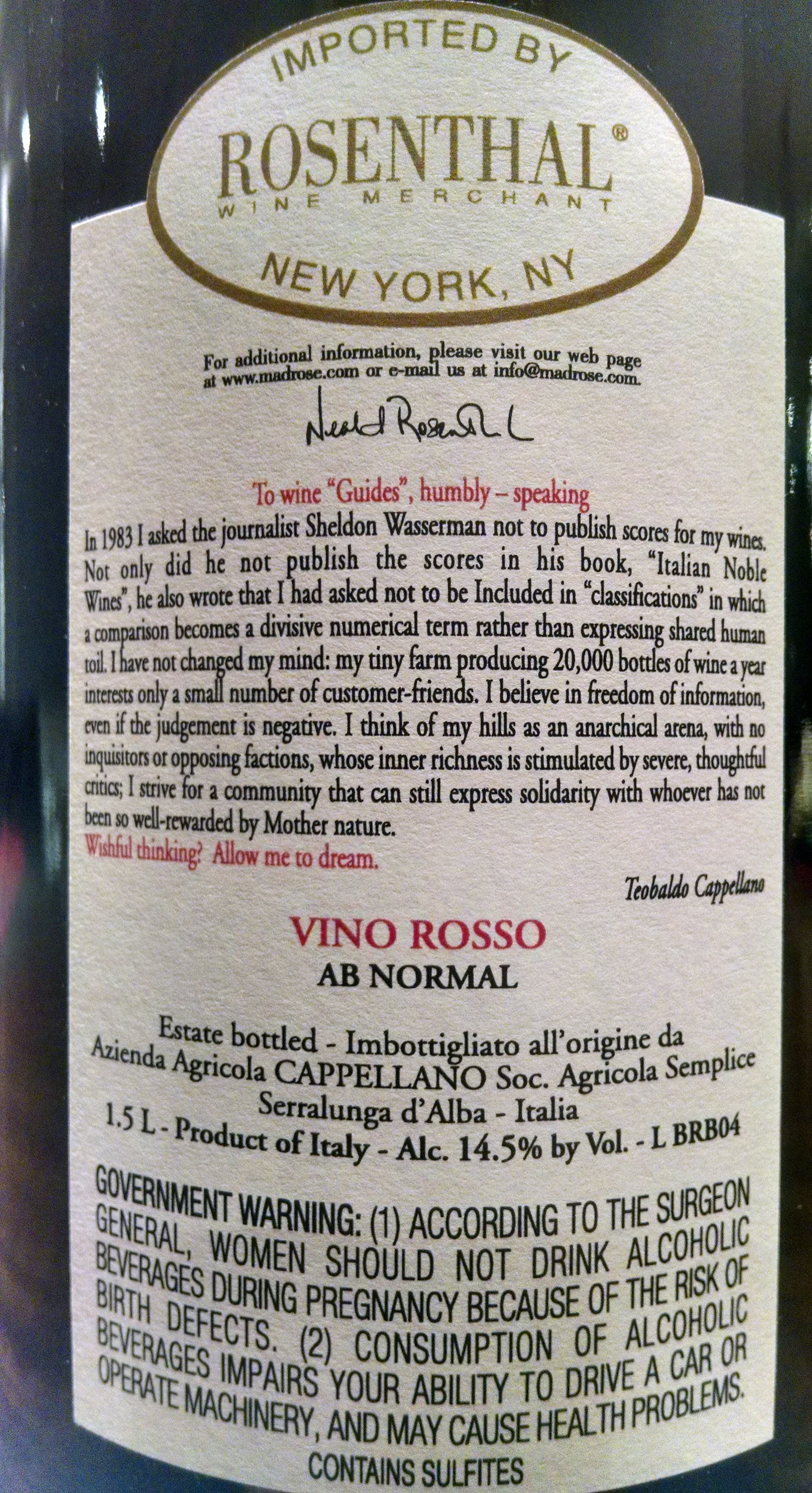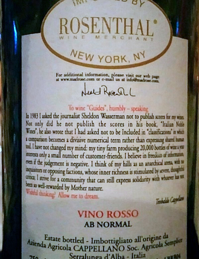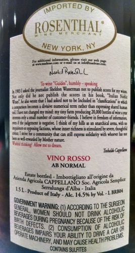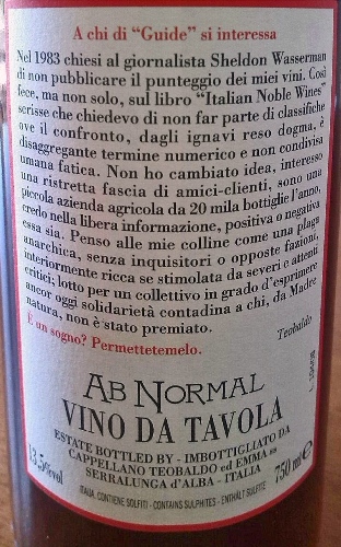 Cappellano AB Normal Vino Rosso NV: Occasionally we are presented with a wine that falls a little outside the normal progression of vintages from a particular grower. These might come about due to an extreme vintage, a strange development during vinification or elevage, or something completely out of the realm of the normal course of cellar work. In the spring of 2016, we will release a small quantity of one such anomaly, from the cellar of Augusto Cappellano. The wine was actually vinified by his father, the late Teobaldo Cappellano, as it comes from the classic 2004 vintage. The wine itself is somewhat unusual to begin with, as it is sourced from old Barbera vines found in the heart of the famed Gabutti vineyard in Barolo. His neighbors have questioned him for years on the existence of these vines in such valuable Nebbiolo terroir, however Augusto feels that Barbera is equally at home in this environment and has let the vines continue to produce. The current release of the Barbera d’Alba “Gabutti” is the 2011, however the spring release will include this small batch of 2004 to accompany it.About 160 cases were made of this wine in 750ml and magnums.