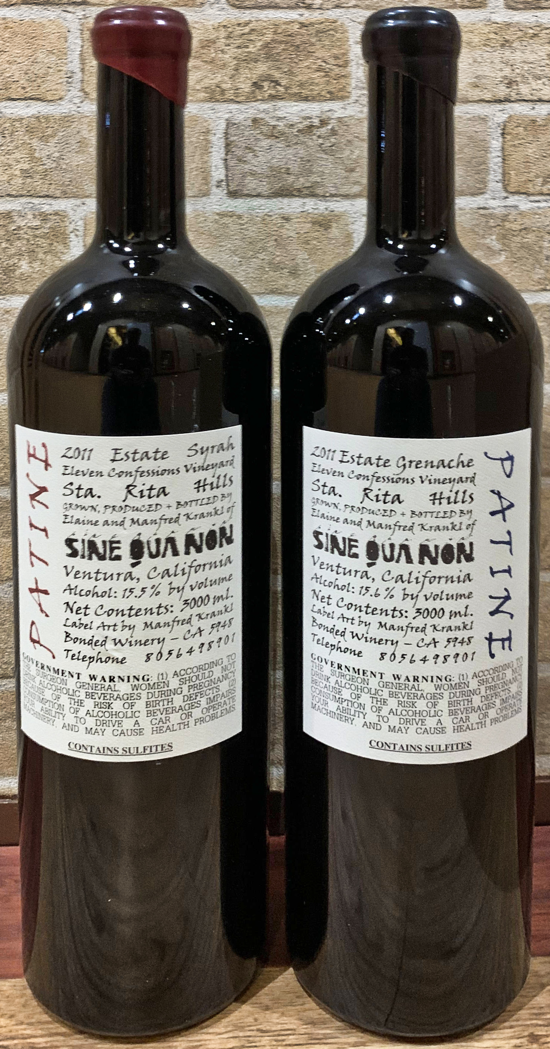 Three liter bottle of 2011 Patine Syrah (left) and Grenache (right):