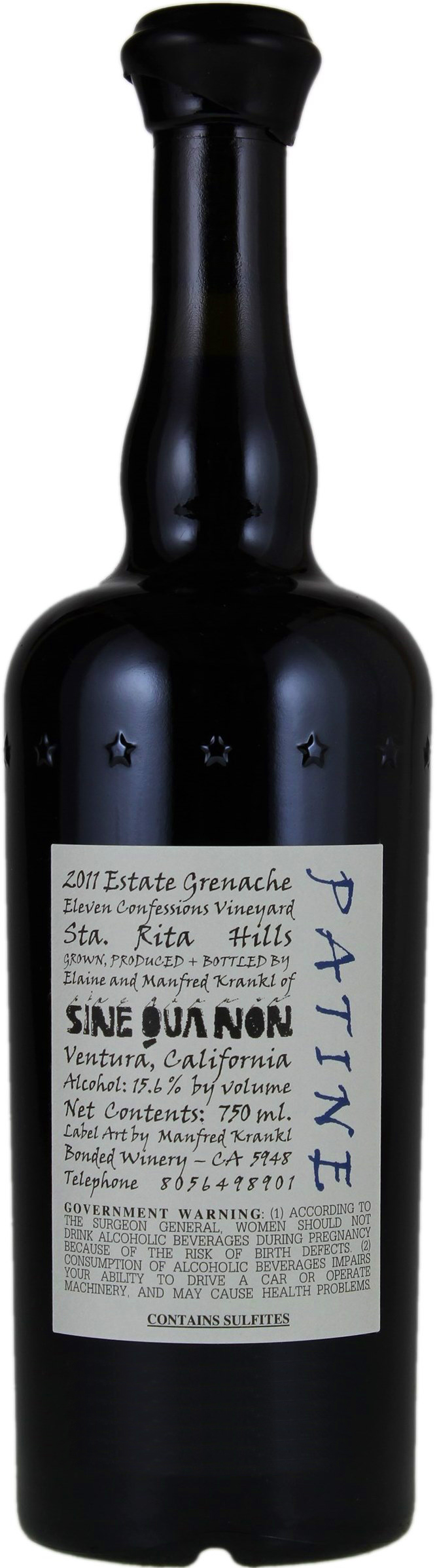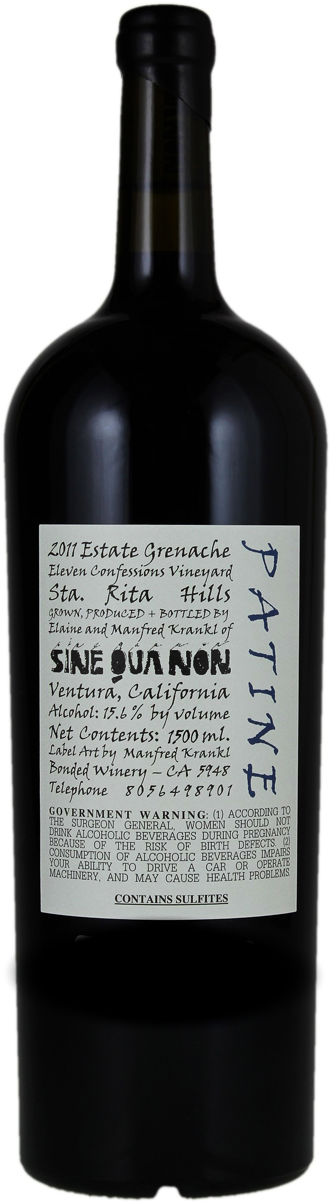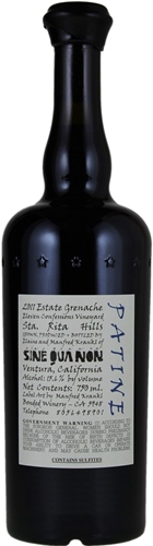 The 2011 Patine Grenache has a black capsule and blue name (on the back), and