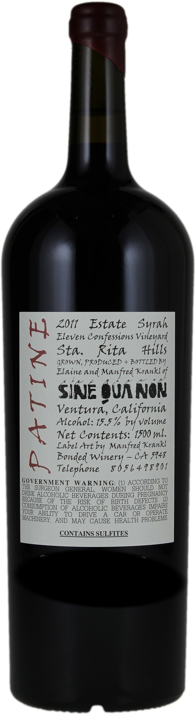 The 2011 Patine Syrah has a red capsule and red name (on the back), and