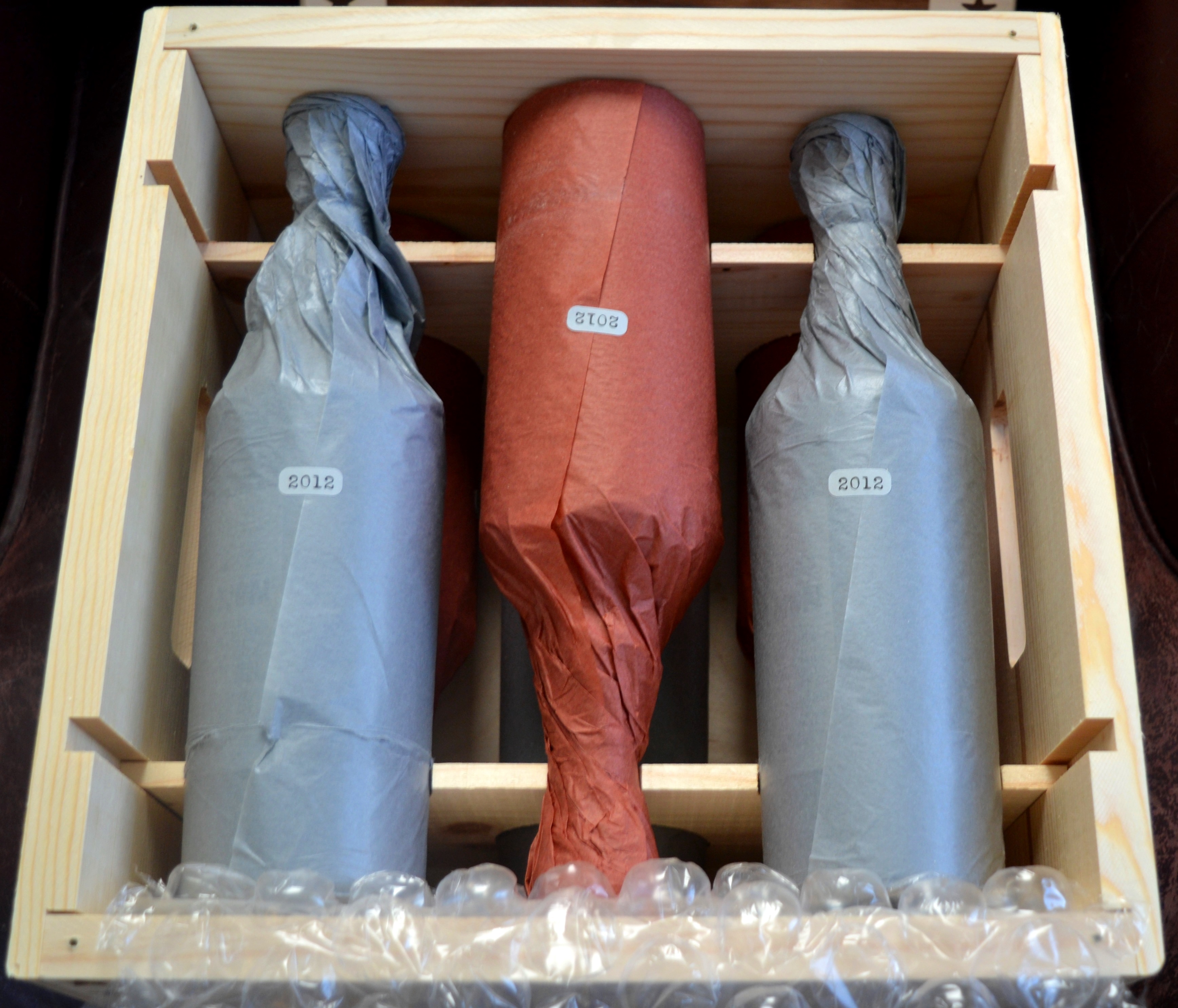 - shipped November 2016 in the wood box pictured below with three bottles of each wine.