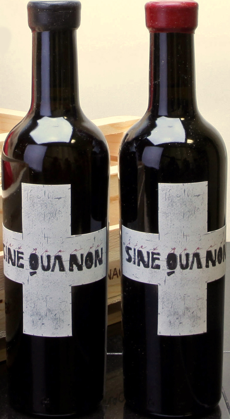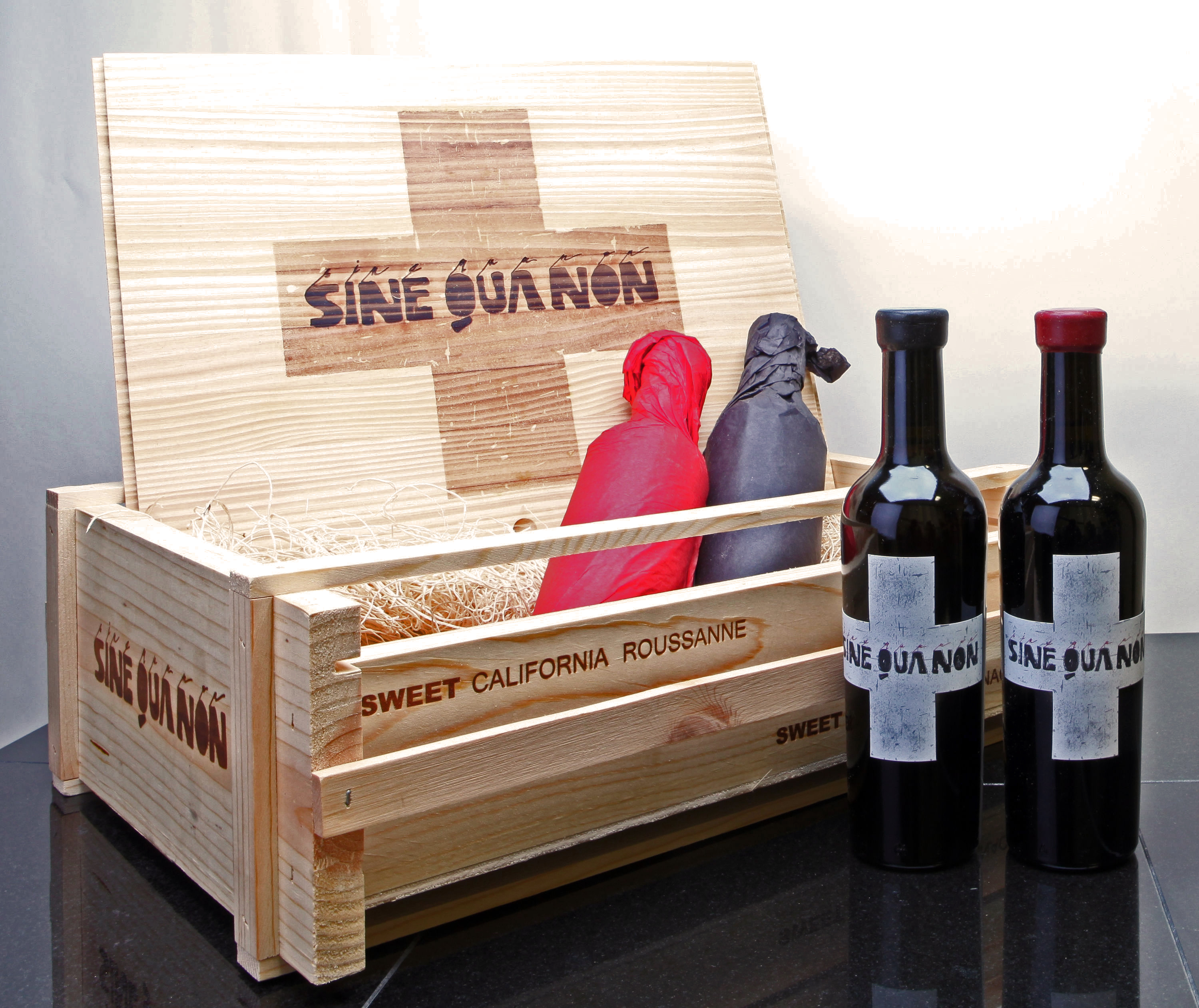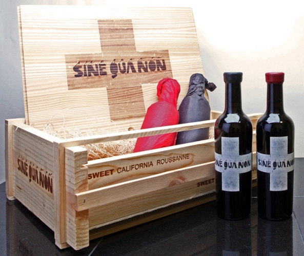 Two half bottles of the 2006 SQN To the Rescue Roussanne Vin de Paille and two half bottles of the 2007 To The Rescue Grenache Vin de Paille. The Roussanne has a black wax capsule. The Grenache has a red wax capsule. Mailing list price for the set: $500.