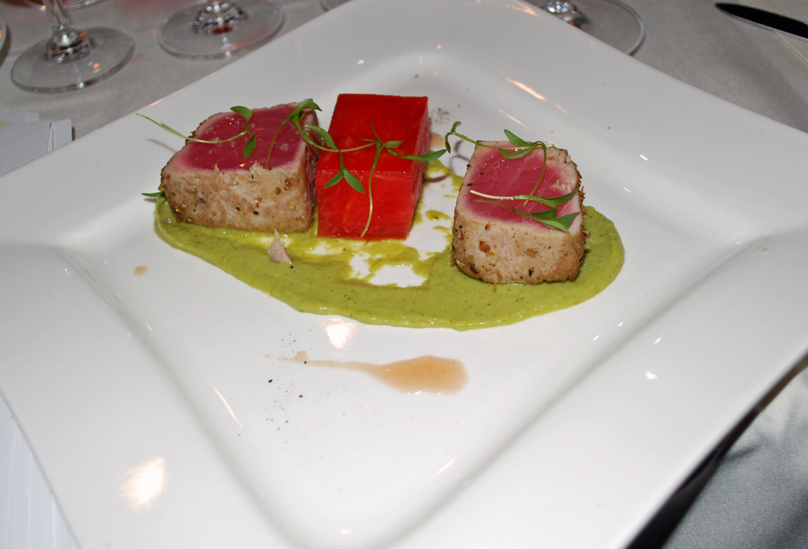 With Coriander-Crusted Ahi Tuna with Pressed Watermelon, Avocado Paint, & Micro Cilantro.