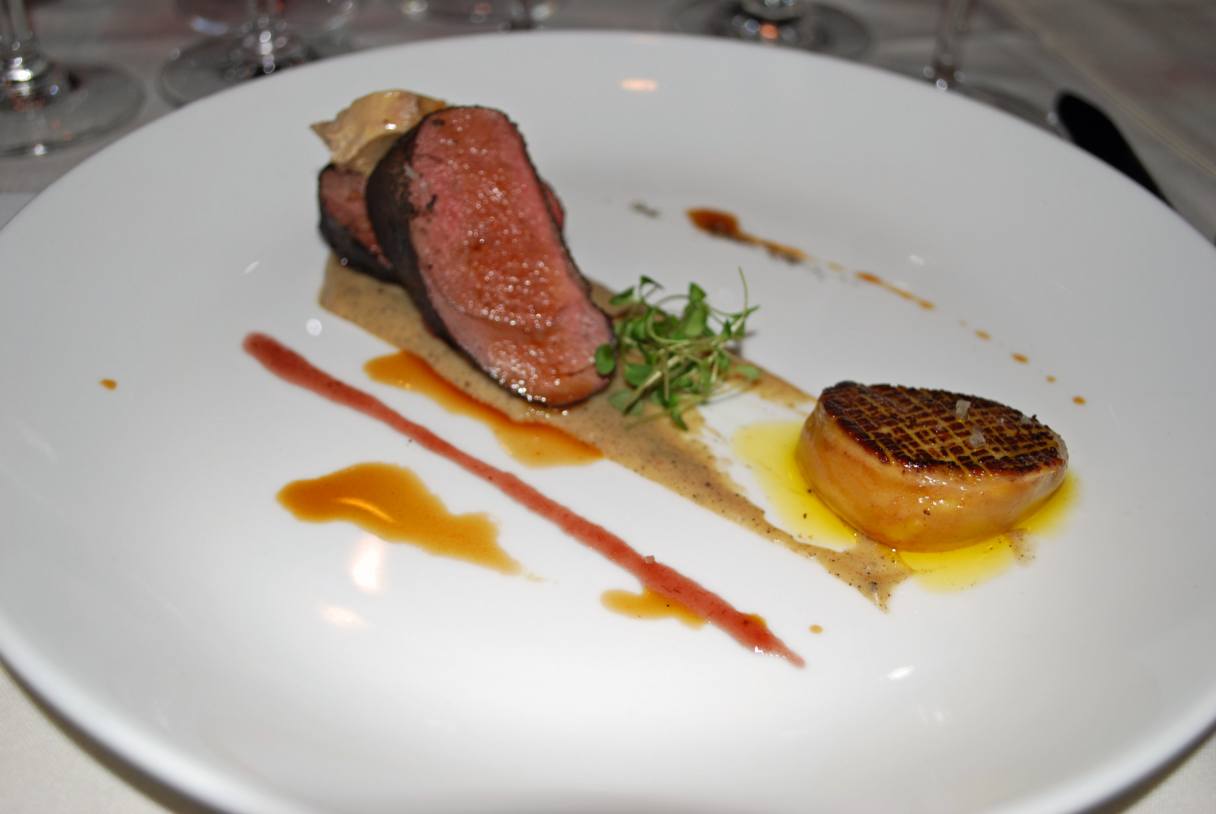 With Coffee-Dusted Duck Breast and Foie Gras with Caramelized Banana Puree & Torchone [sic].