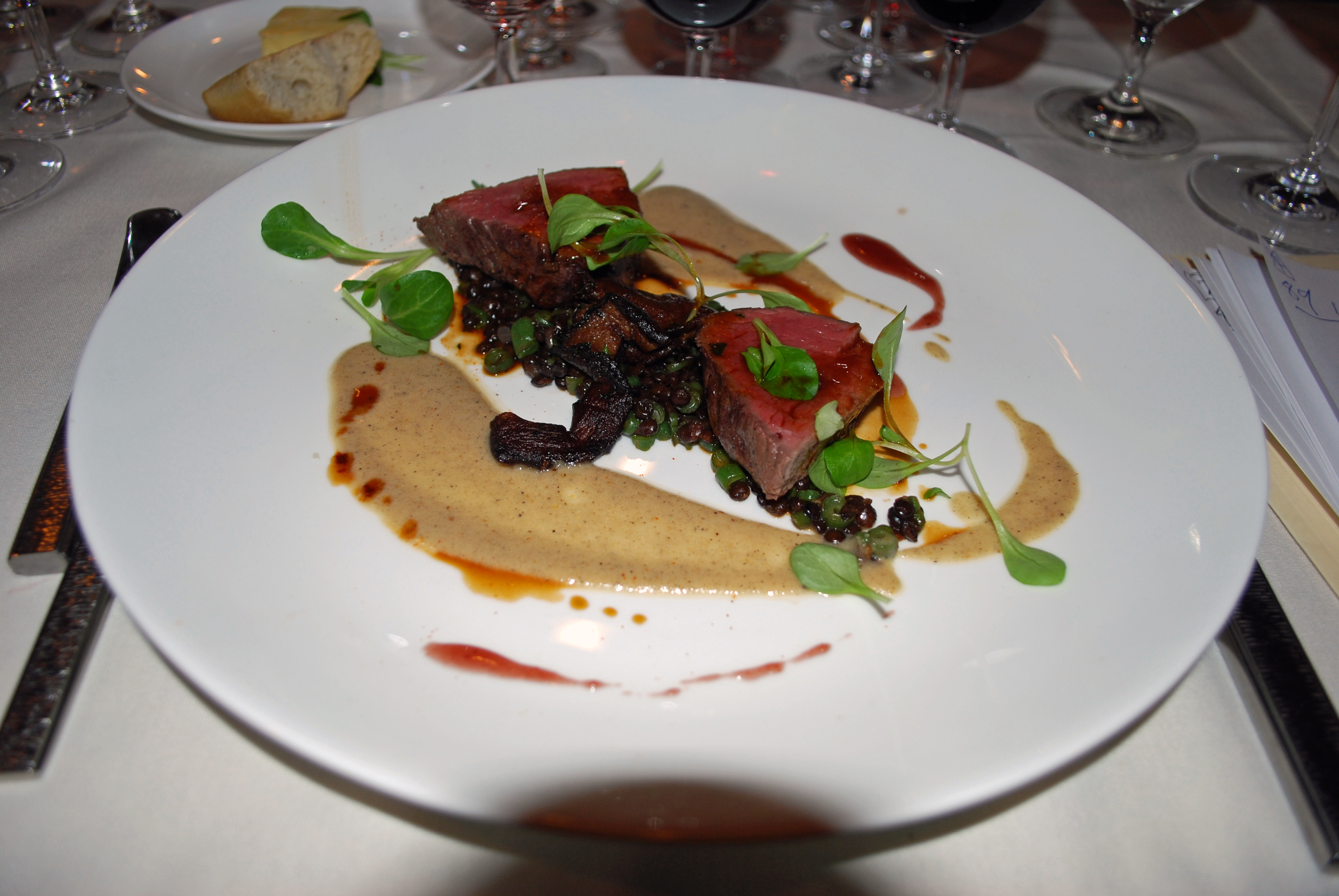 With Grilled Filet of Beef with Crispy Shitakes, Braised Lentils, and Ash-Roasted Eggplant Sauce.