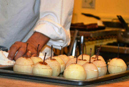 Poached pear with mild blue cheese inside. |