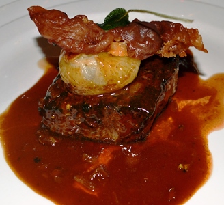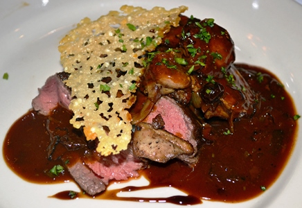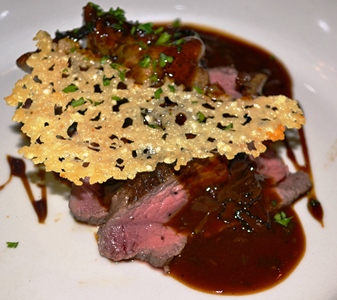Seared Strip Steak with Foie Gras, Truffles, Braised Potatoes, and Parmesan Crisp.
