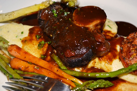 Venison Osso Buco over Soft Pol-Lina with Roasted Vegetables.