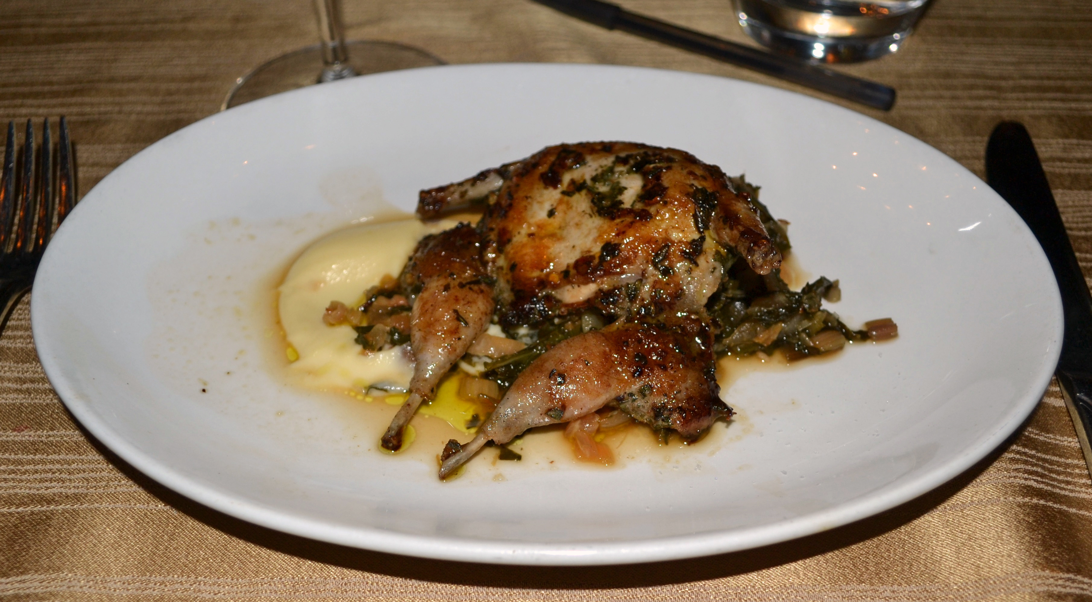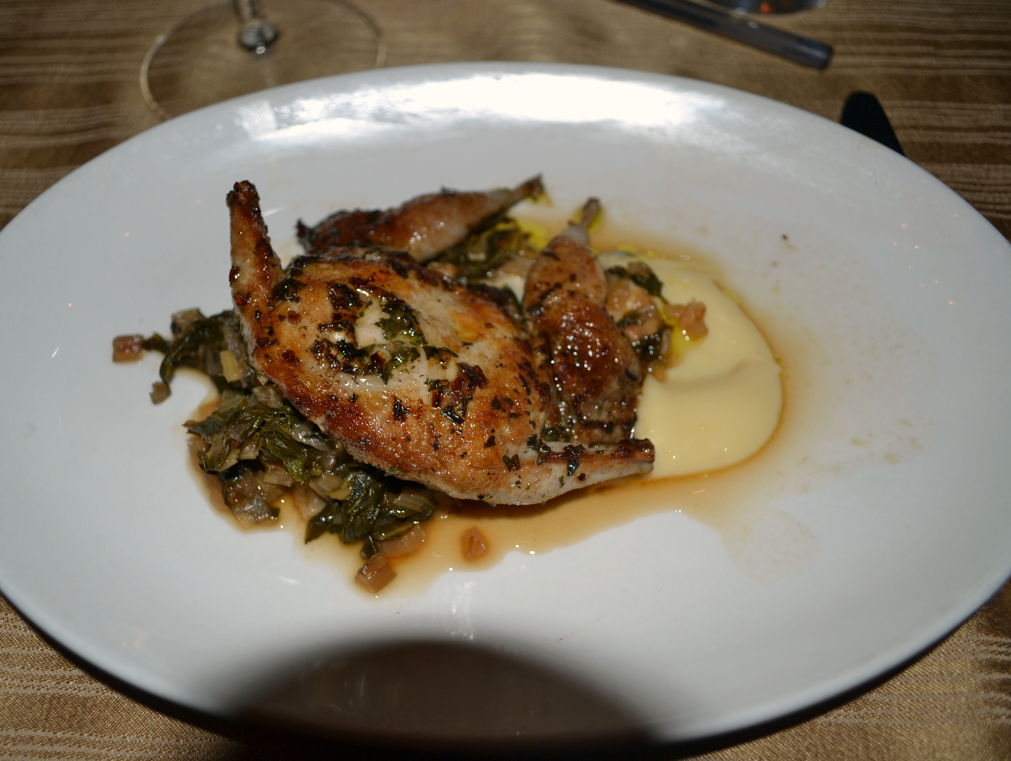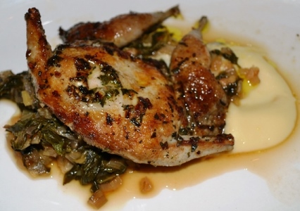 Quail a la Plancha with Rainbow Swiss Chard and Parsnip Puree.