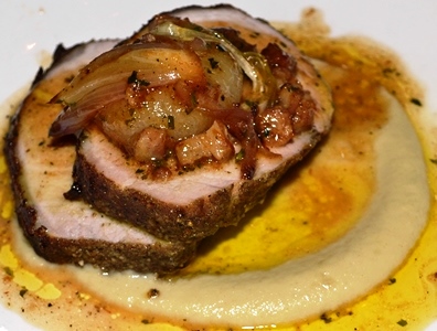 Fennel Crusted Pork Loin with Spring Onion, Fennel Puree and Pancetta.