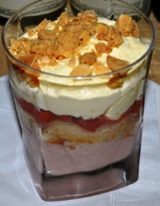Rhubarb Tiramisu with Mascarpone Mousse, Brachetto Syrup and Amaretti Crumbs.