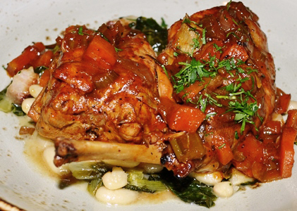 Braised Rabbit Cacciatore over Escarole, Cannellini Beans, House Bacon, Black Pepper.